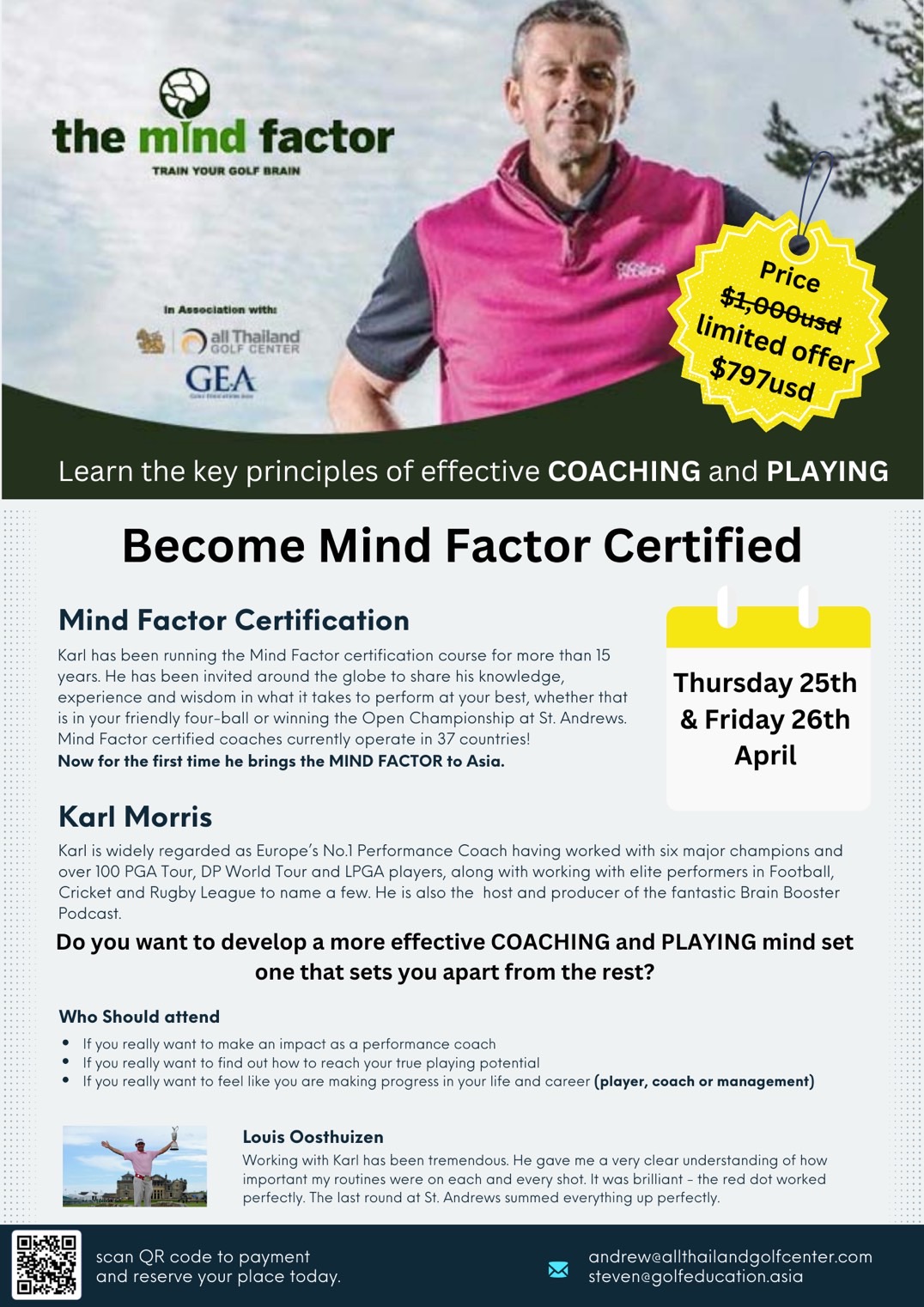 คาร์ล มอร์ริส ยอดโค้ชด้านจิตวิทยามือ 1 ของยุโรป เปิดโอกาสให้นักกีฬา และผู้สนใจ ร่วมพัฒนาการฝึกสอน และการเล่นให้มีประสิทธิภาพมากขึ้นกับ คาร์ล มอร์ริส นักจิตวิทยากีฬาชั้นนำระดับโลก ในฐานนะโค้ชอันดับ 1 จากยุโรป ผู้สร้างหลักสูตรจนเป็นที่รู้จักมากกว่า 15 ปี ร่วมงานกับนักกีฬาชั้นนำระดับโลกมาแล้วมากมาย โดยการอบรมครั้งนี้นี้มีขึ้นครั้งแรกใน เอเชีย ระหว่างวันที่ 25-26 เมษายน 2567 ที่ ออลไทยแลนด์ กอล์ฟ เซ็นเตอร์