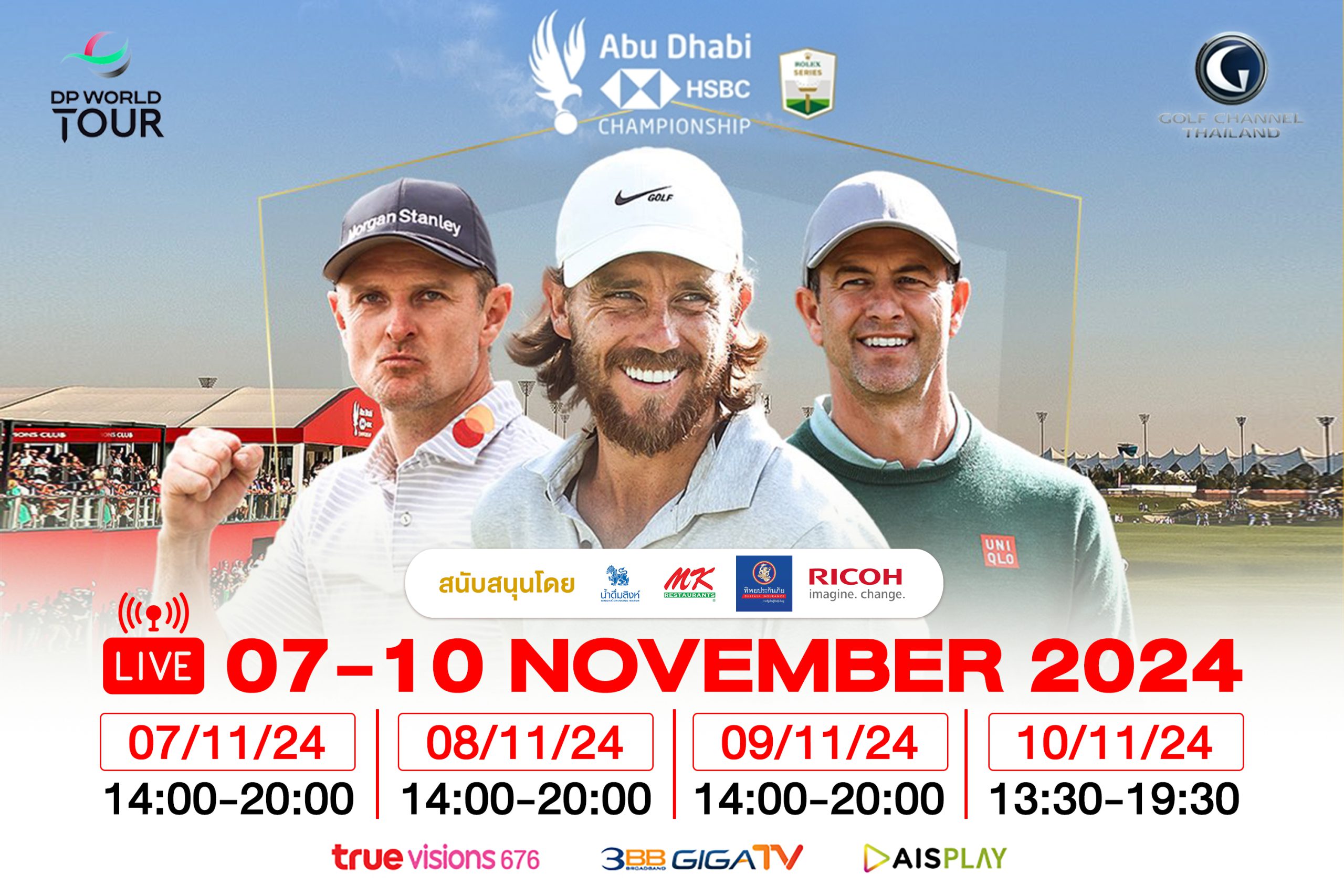 ติดตามถ่ายทอดสดการแข่งขันกอล์ฟ DP World Tour รายการ Abu Dhabi HSBC Championship 2024 ที่สนาม Yas Links, ประเทศสหรัฐอาหรับเอมิเรตส์ ชิงเงินรางวัลรวม USD 9,000,000 หรือประมาณ 304 ล้านบาท