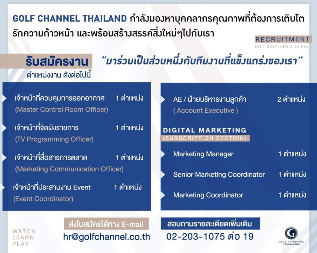 Golf Channel Thailand ประกาศรับสมัครงาน
