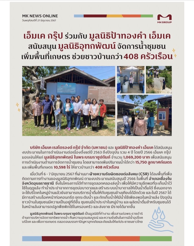 เอ็มเค กรุ๊ป ร่วมกับ มูลนิธิป้าทองคำ เอ็มเค สนับสนุน มูลนิธิอุทกพัฒน์ จัดการน้ำชุมชนเพิ่มพื้นที่เกษตร ช่วยชาวบ้านกว่า 408 ครัวเรือน