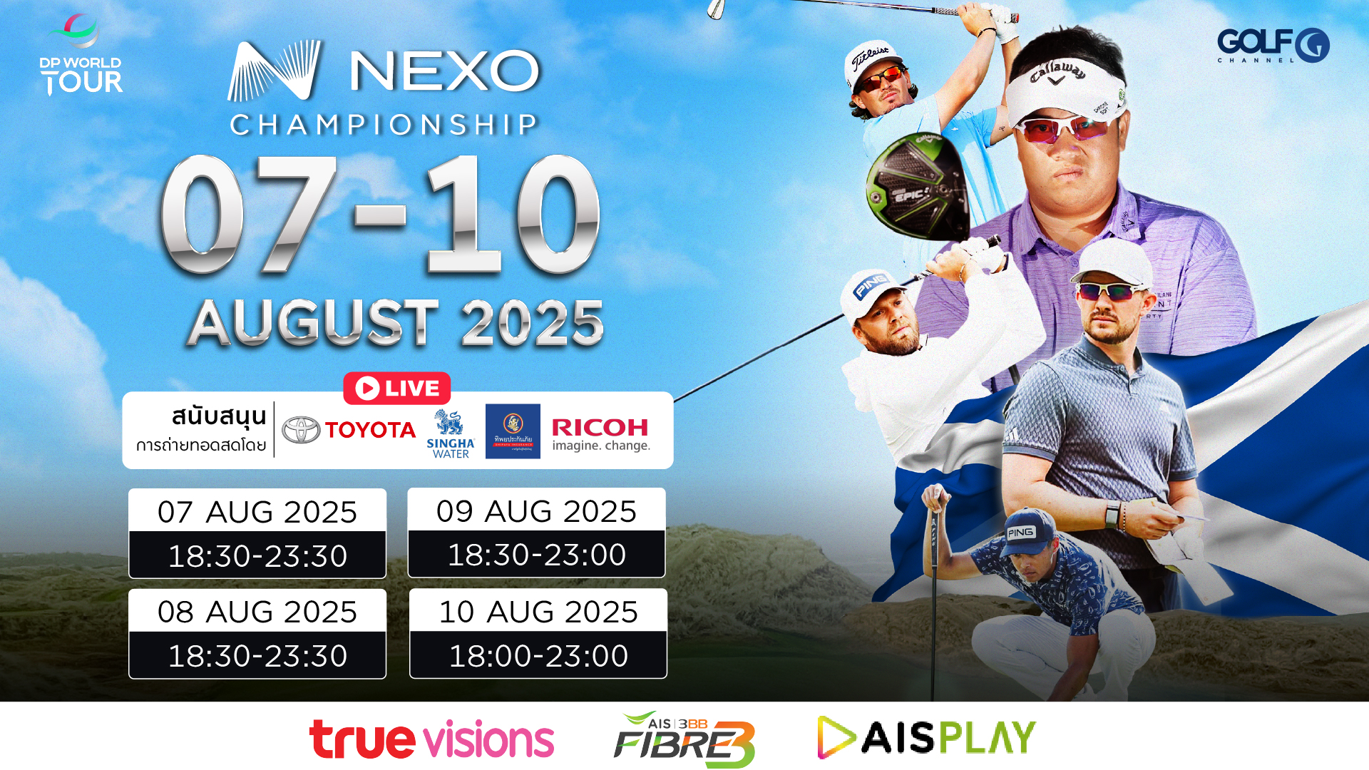 ติดตามถ่ายทอดสดการแข่งขันกอล์ฟ DP World Tour รายการ Nexo Championship ที่สนาม Trump International Golf Links ประเทศสกอตแลนด์ ชิงเงินรางวัลรวม $2,750,000 หรือประมาณ 89 ล้านบาท